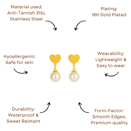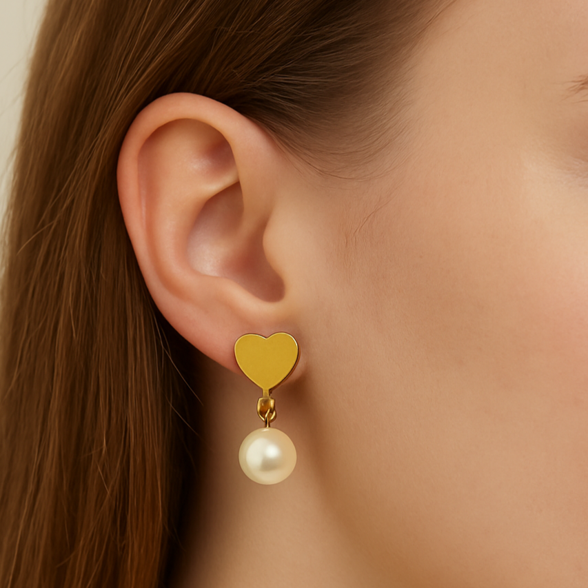 Elegant golden heart studs suspending lustrous faux pearls, perfect for adding a touch of classic romance to any look.