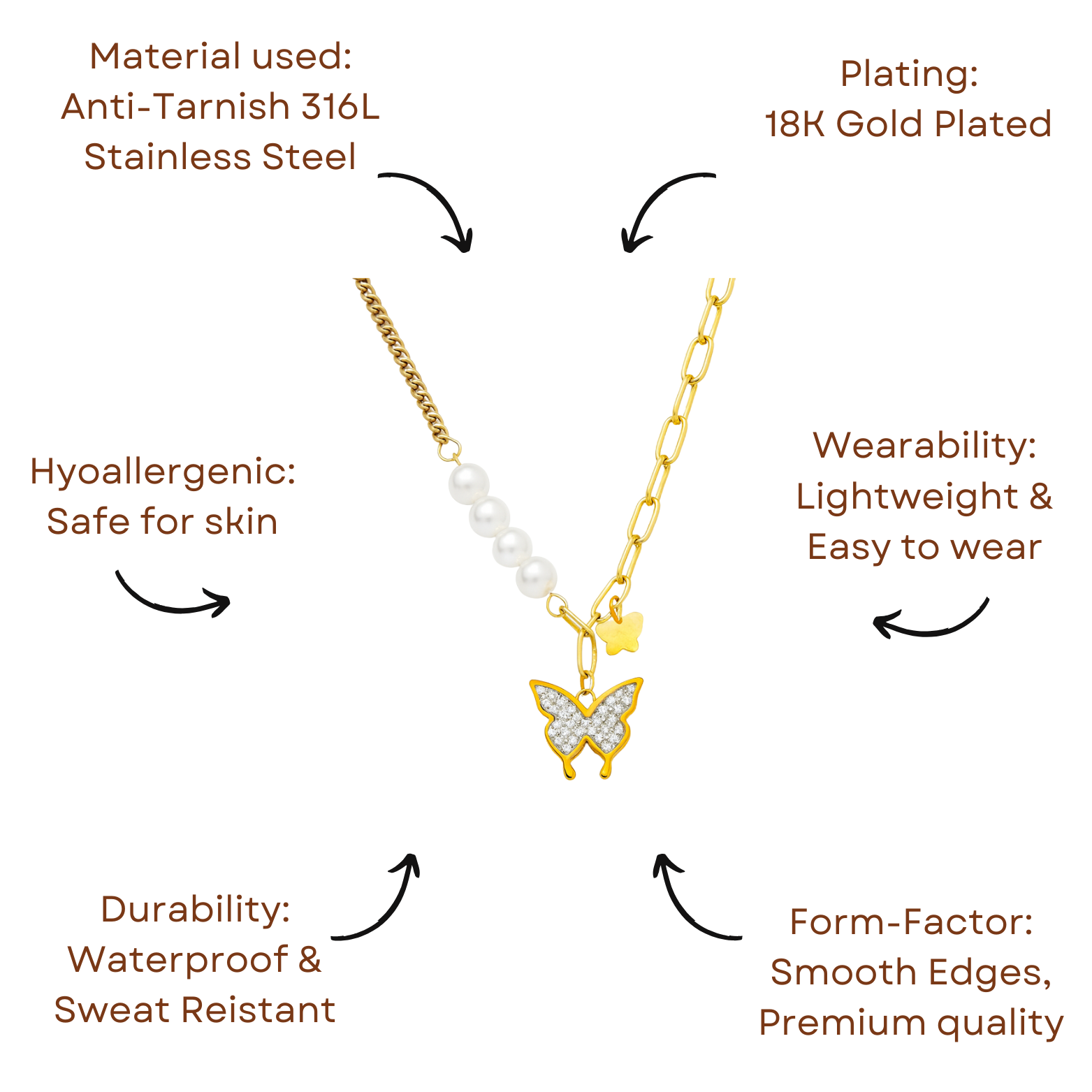 A modern mix of pearls, gold chain links, and a sparkling butterfly charm. A bold yet elegant piece that brings together playfulness and sophistication in one look.