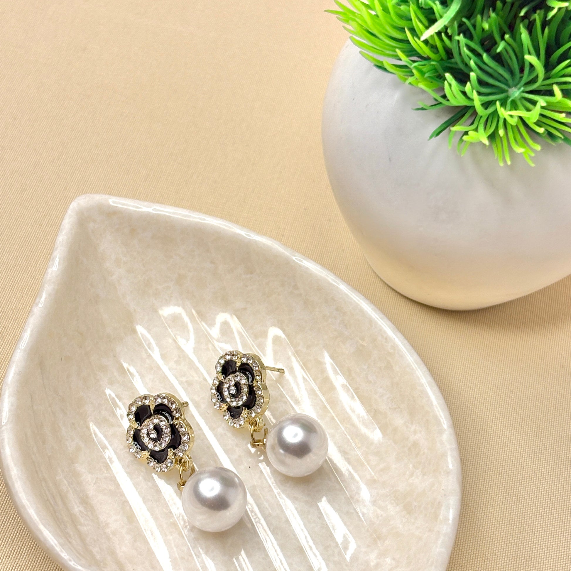 These earrings feature a black enamel rose with shimmering crystals, paired with a lustrous pearl drop. A perfect mix of romance and sophistication for evening elegance.
