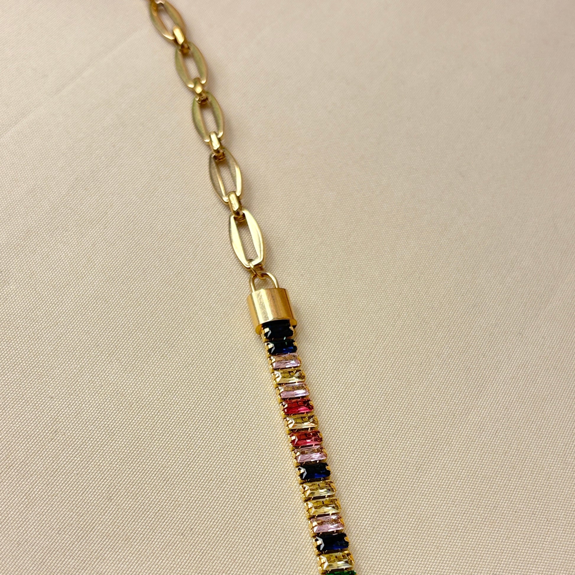A striking bracelet adorned with vibrant gemstone-like accents, set against a sleek chain. Perfect for adding a pop of elegance and color to any outfit.