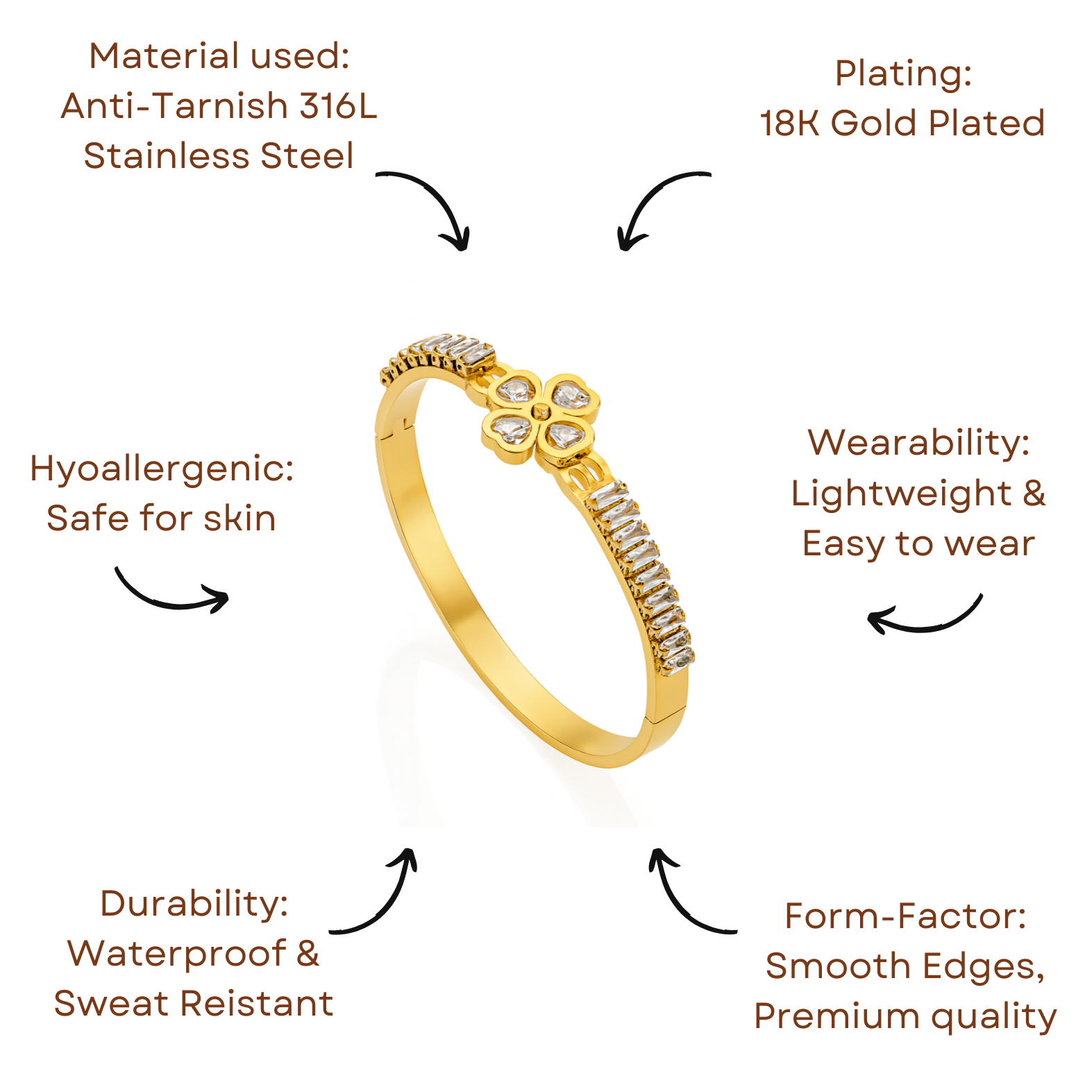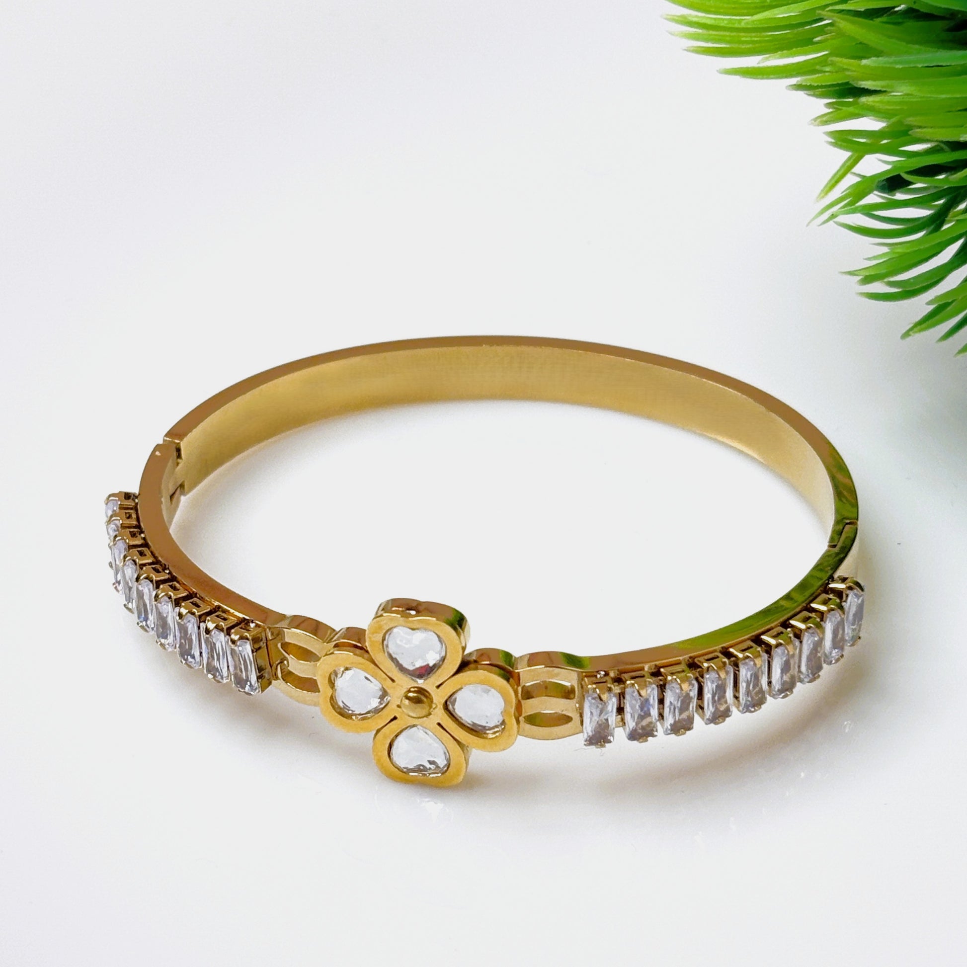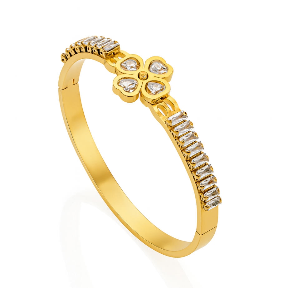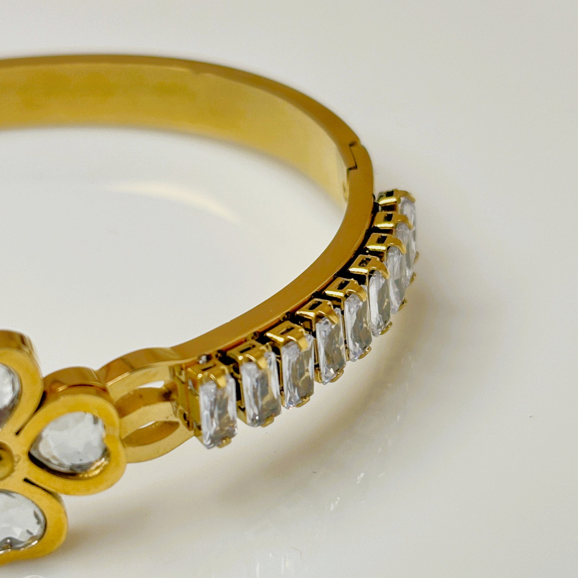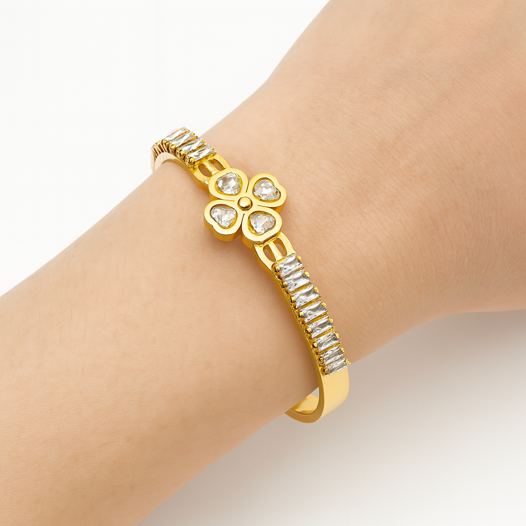A symbol of luck and luxury — Radiant Clover shines with a floral charm of crystal-cut petals framed in gold. Its sleek bangle silhouette and glistening stones make it a timeless piece for every elegant moment.