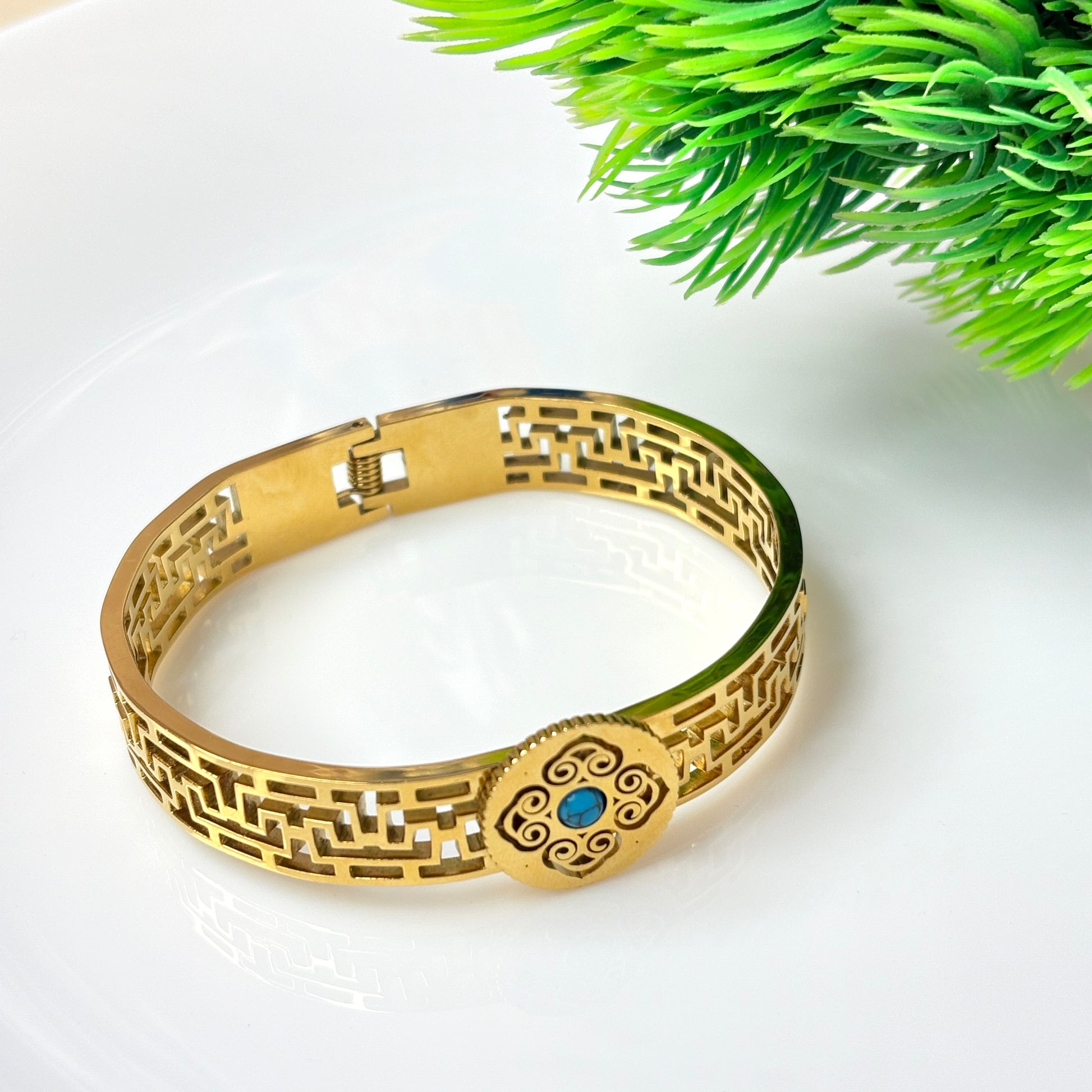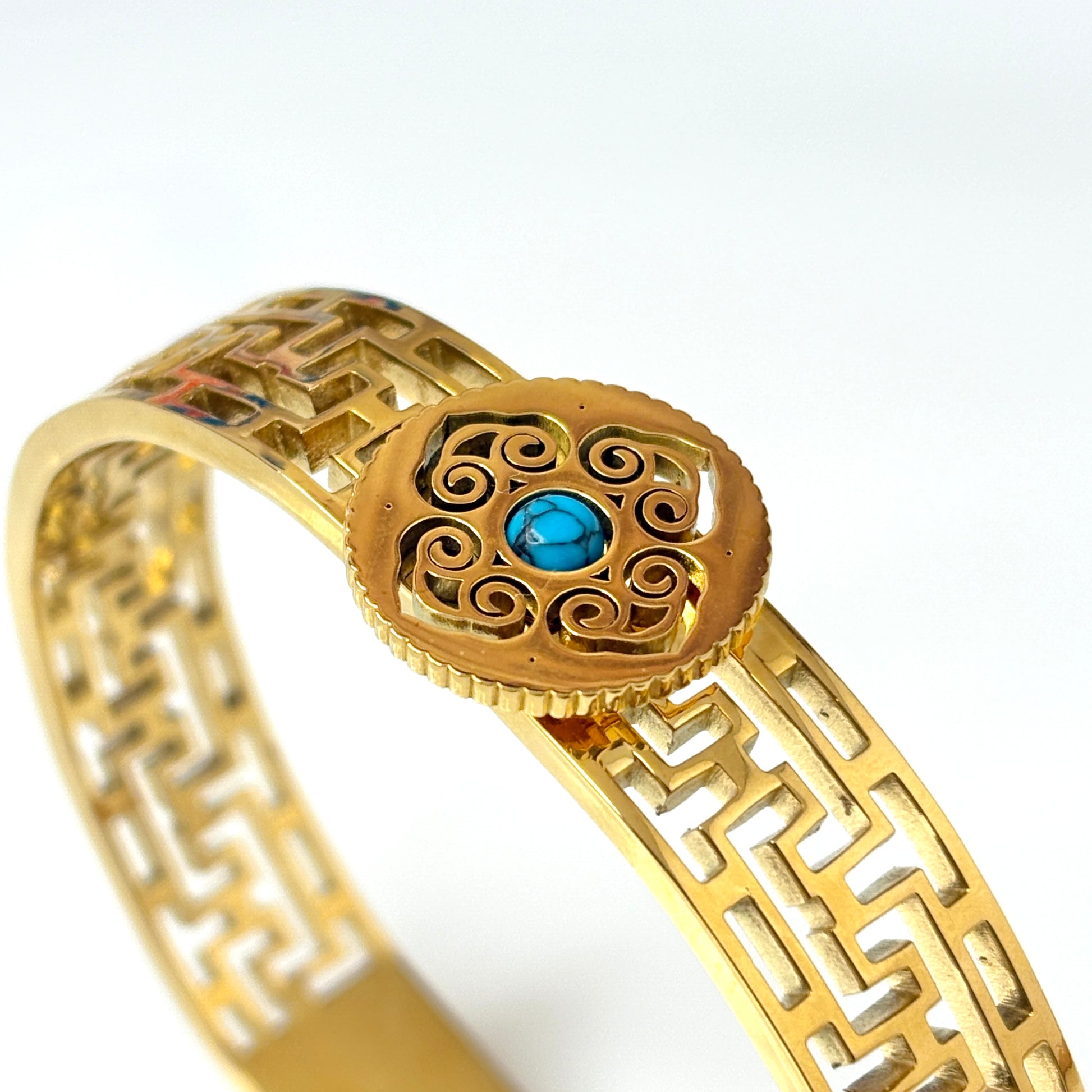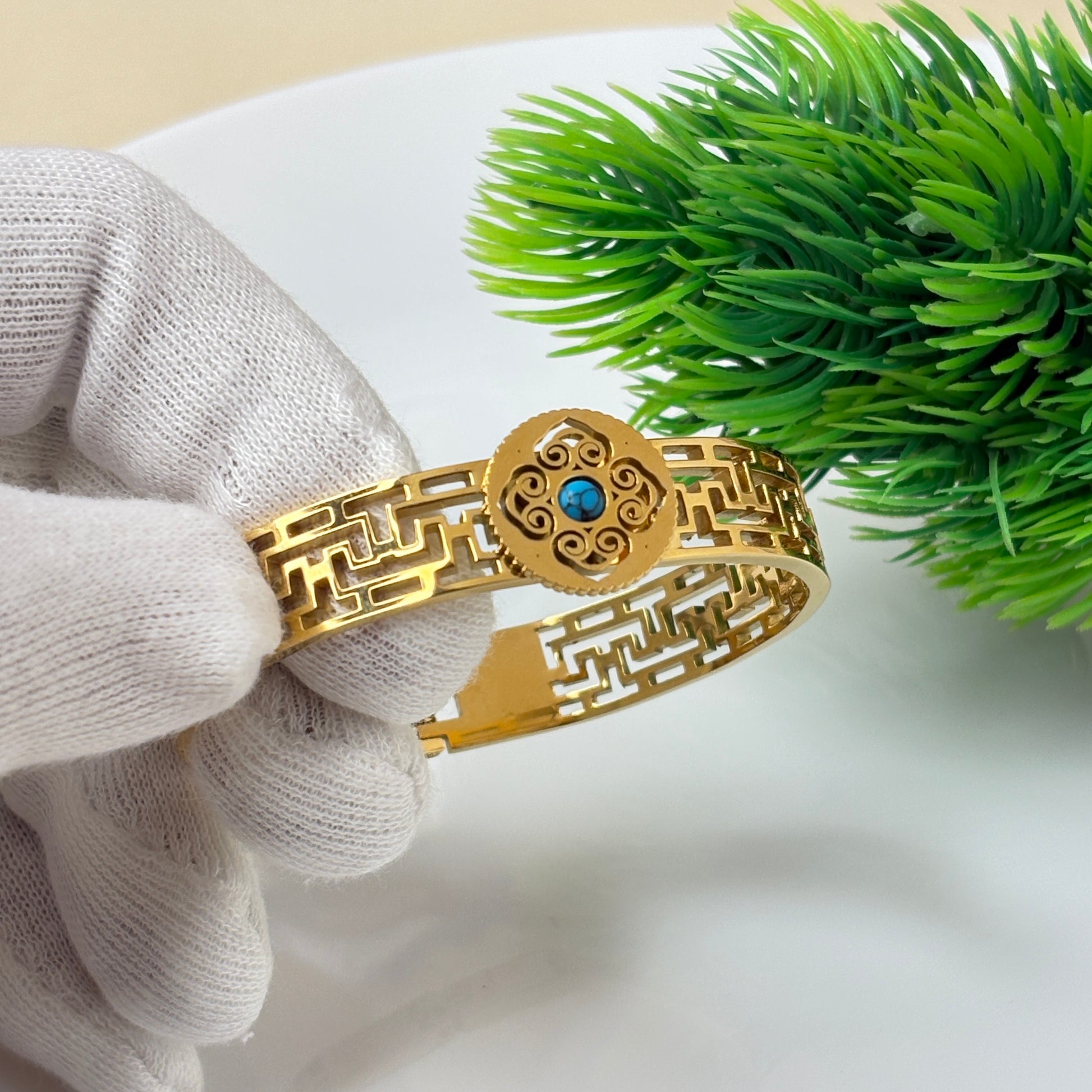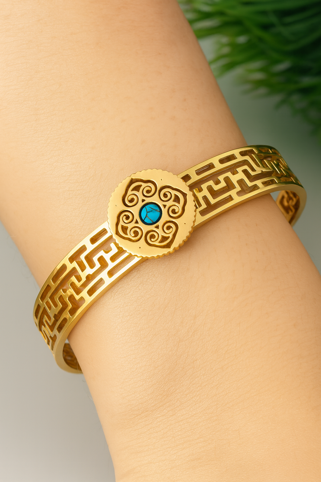 An intricate design inspired by timeless heritage, featuring a striking turquoise centerpiece set against a bold cut-out pattern. A perfect balance of tradition and modern elegance.