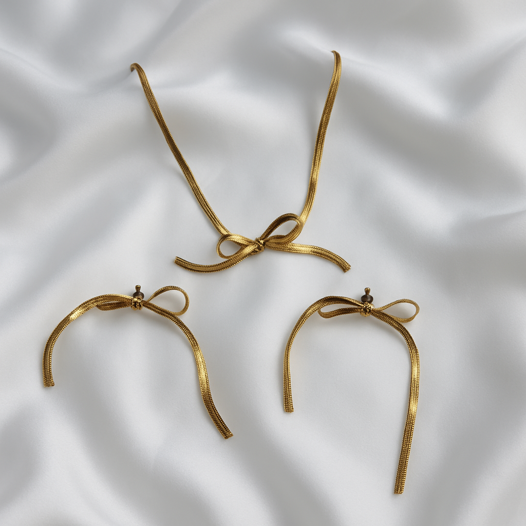 Delicate and feminine, this gold-toned necklace features a charming bow design crafted from a sleek snake chain. The bow adds a playful yet elegant touch, making it perfect for both casual and dressy outfits. Lightweight and versatile, it’s an accessory that subtly elevates any look. A sweet statement piece for those who love graceful details.