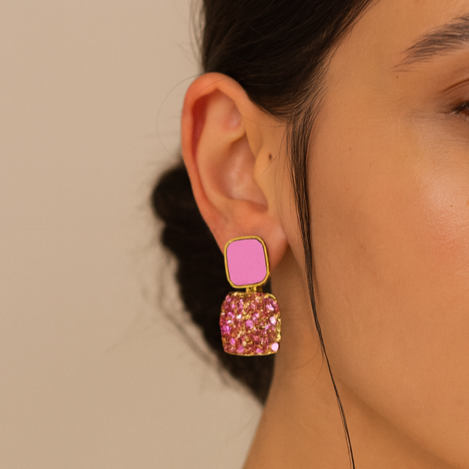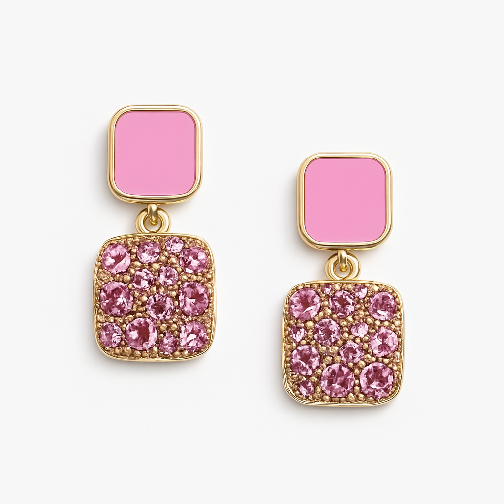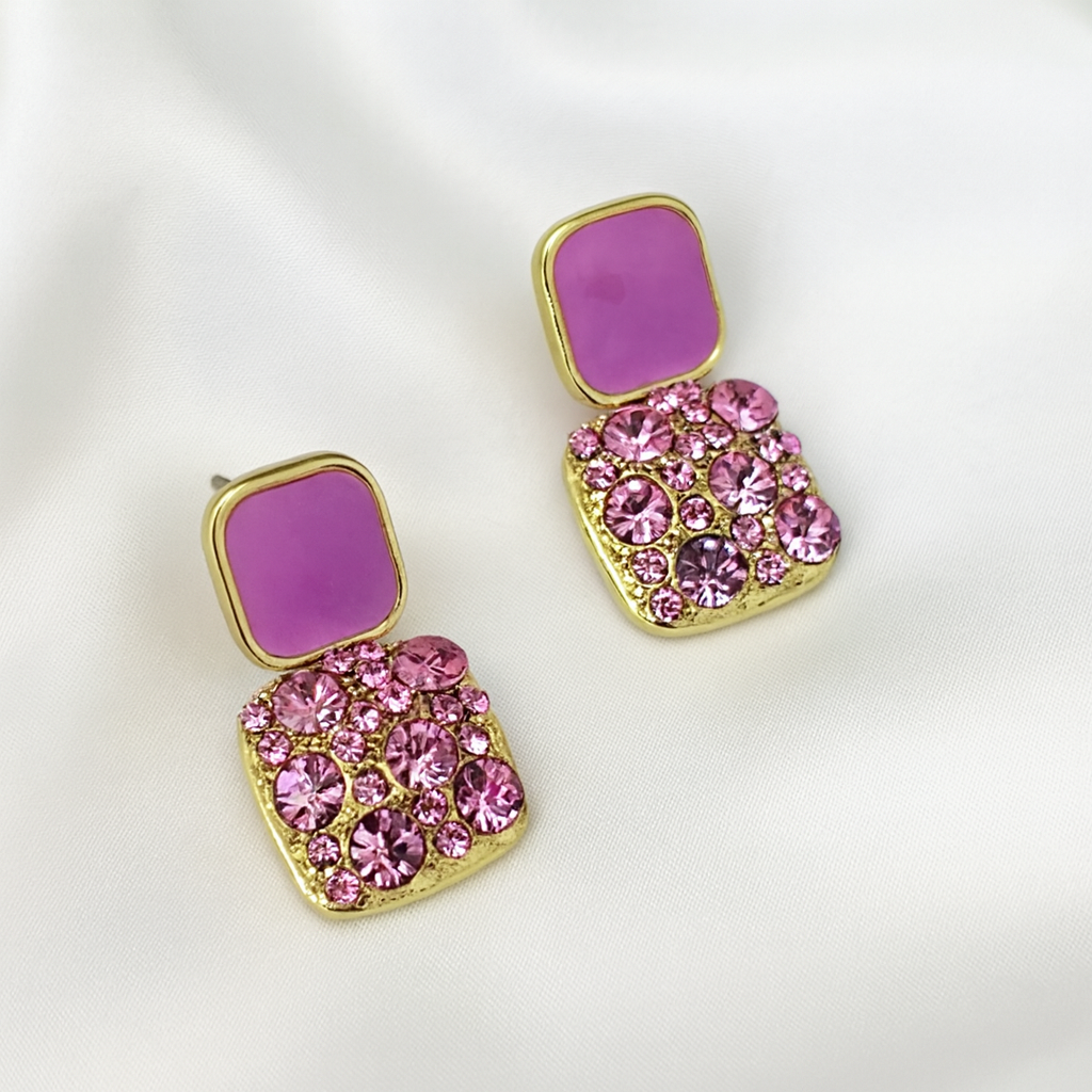 Dazzling with pink crystals and a glossy enamel finish, these earrings bring a playful yet elegant vibe. Perfect for adding a pop of sparkle to your everyday or party look.