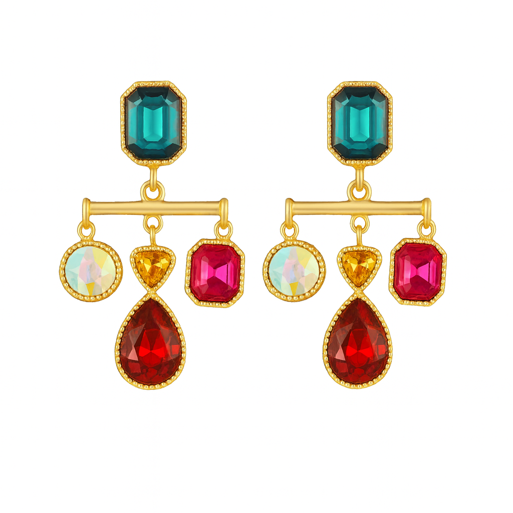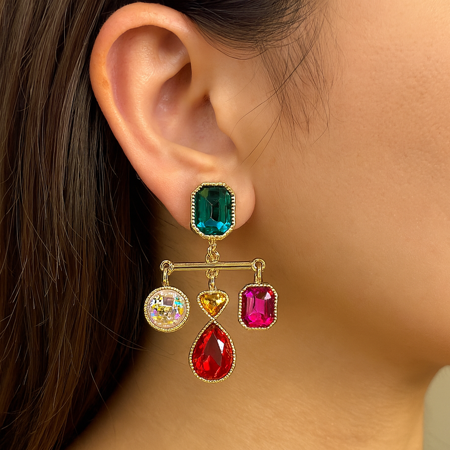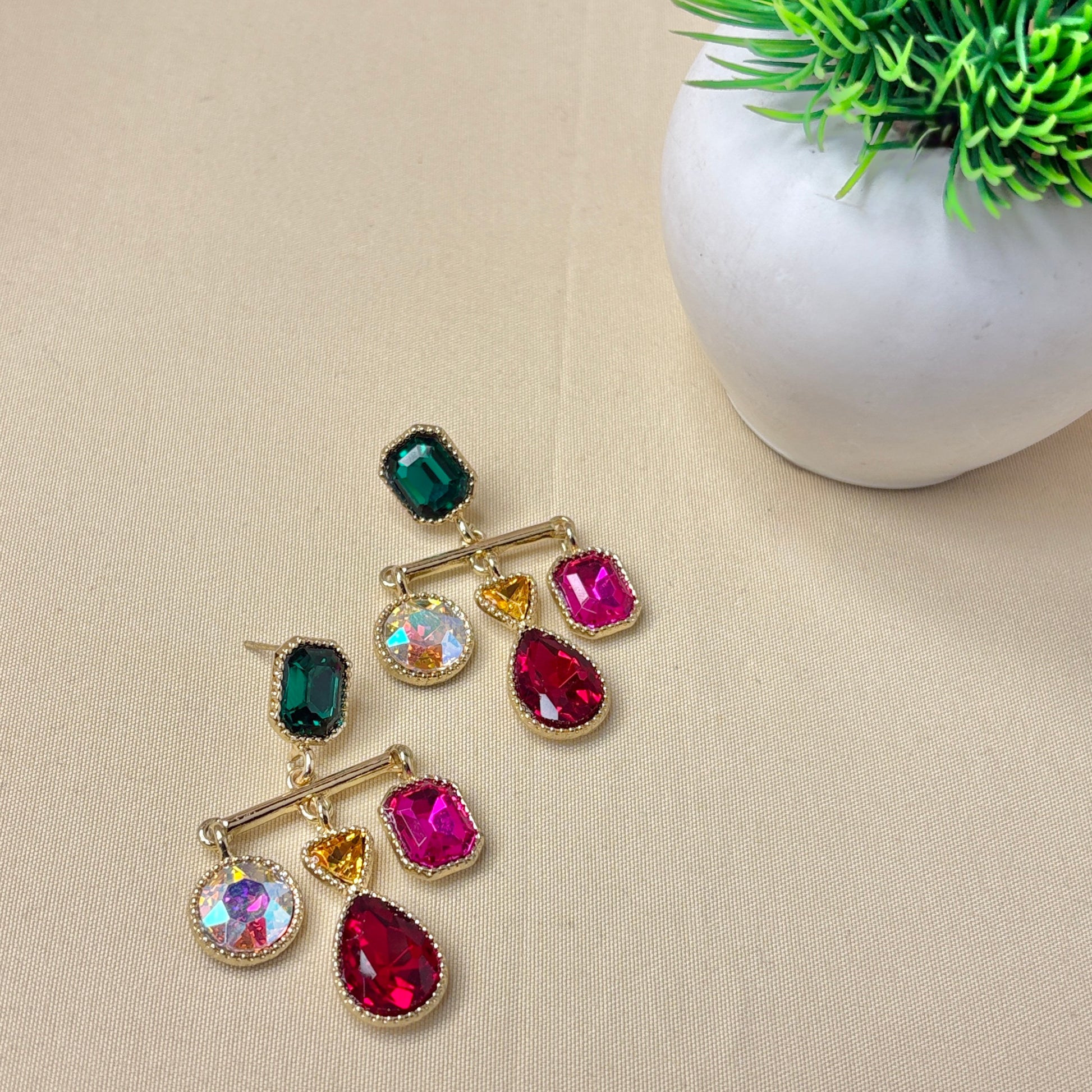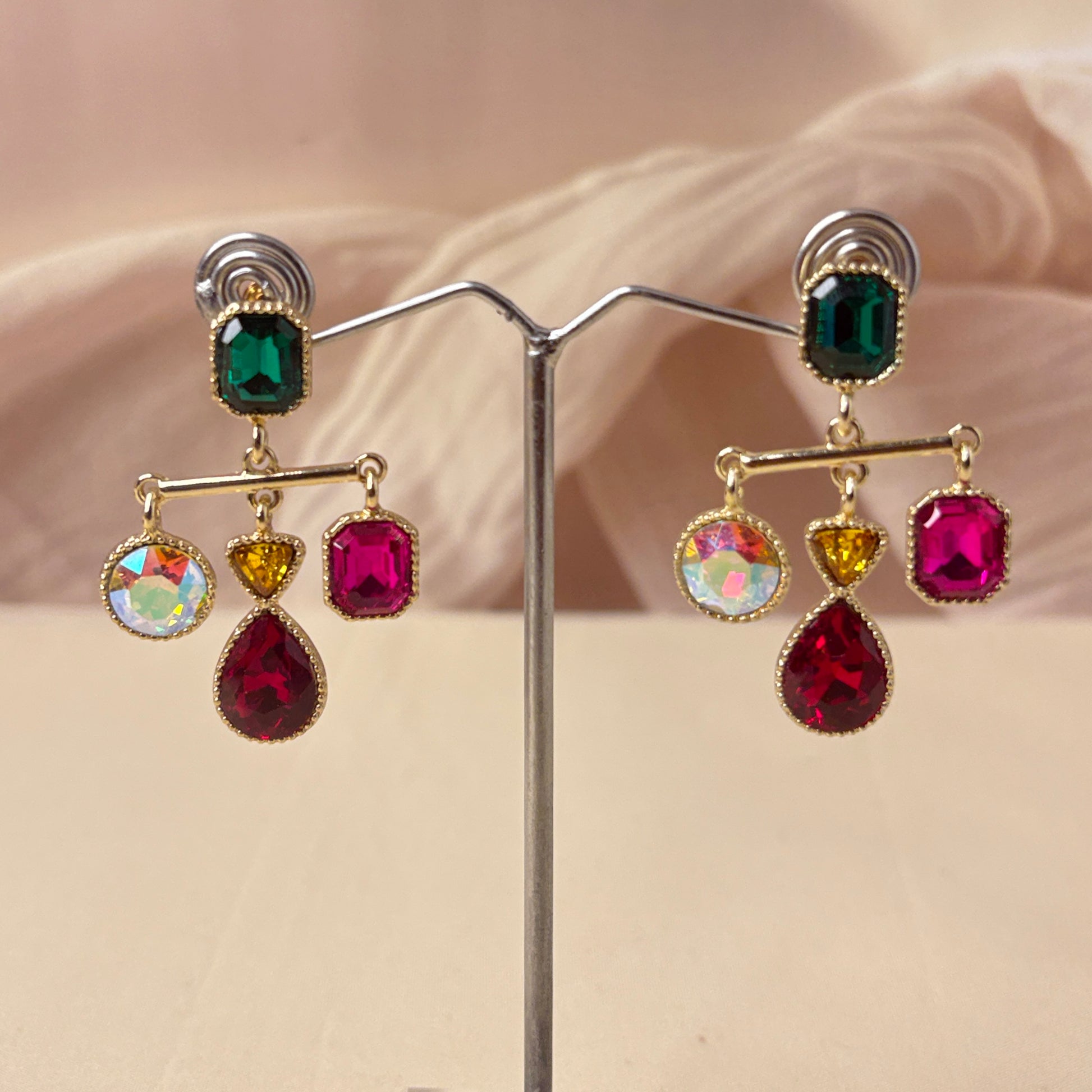 A vibrant mix of emerald, ruby, fuchsia, and crystal drops set in gold, these earrings are made to dazzle. Perfect for festive nights and grand celebrations, they bring unmatched color and glamour to your style.