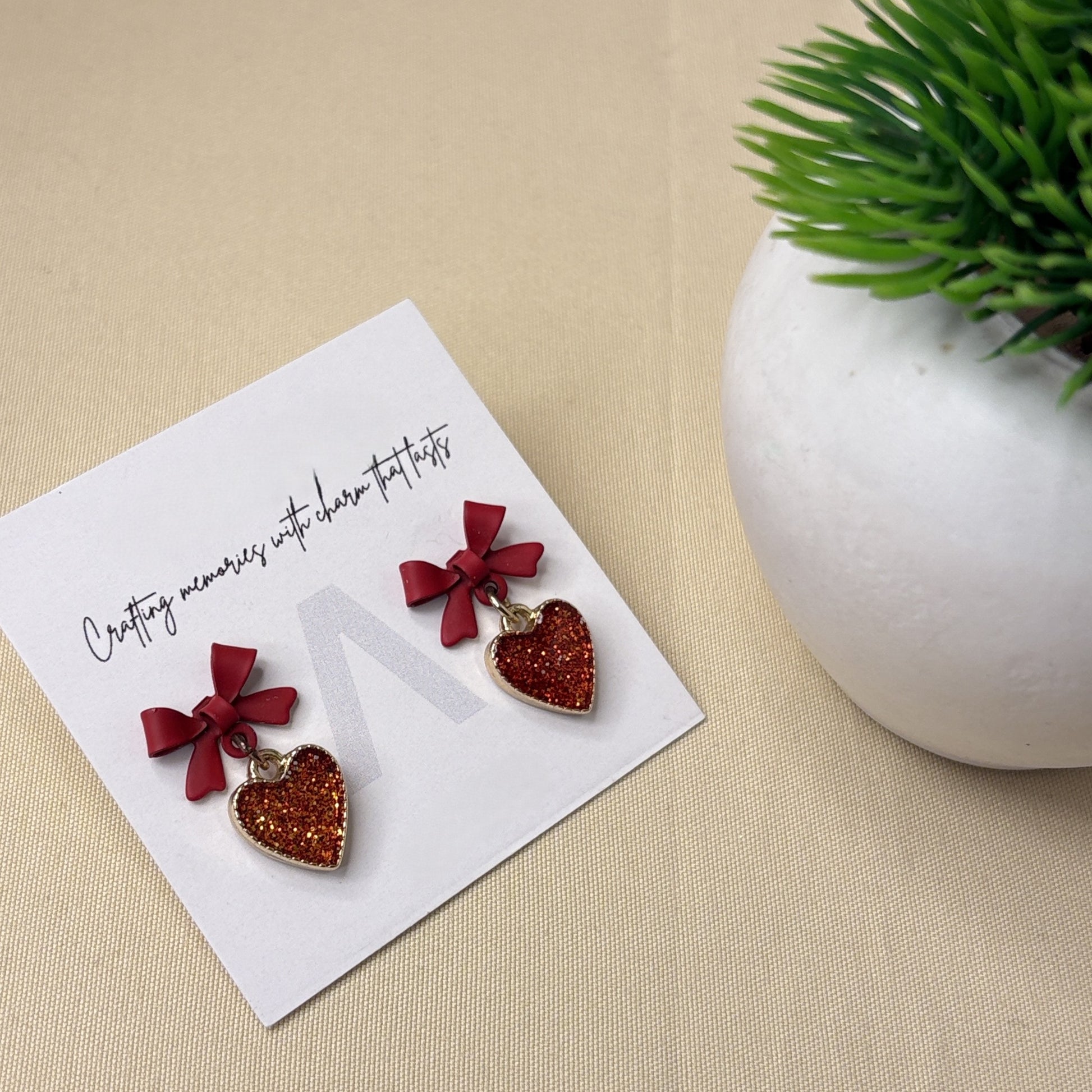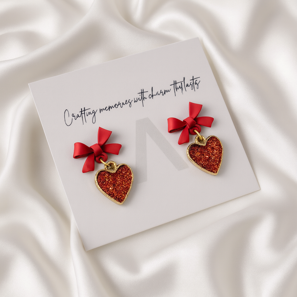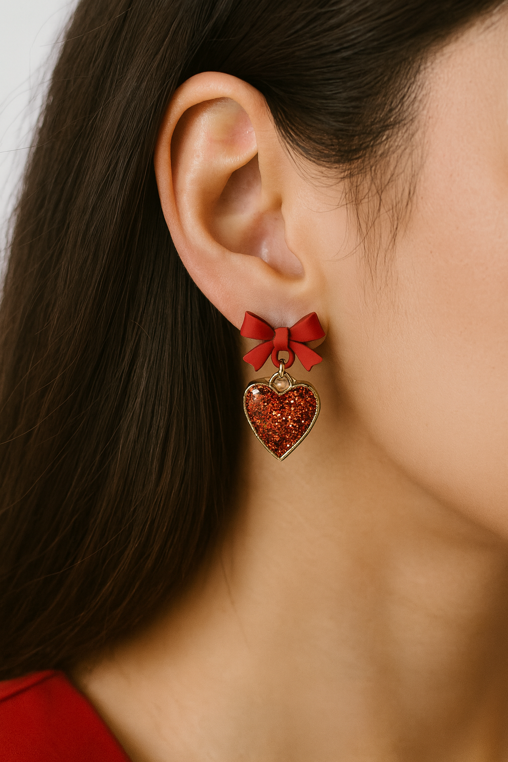These glittering red heart drops paired with dainty red bows radiate playful charm and romance. Perfect for parties, date nights, or whenever you want to sparkle with a bold, fun statement.