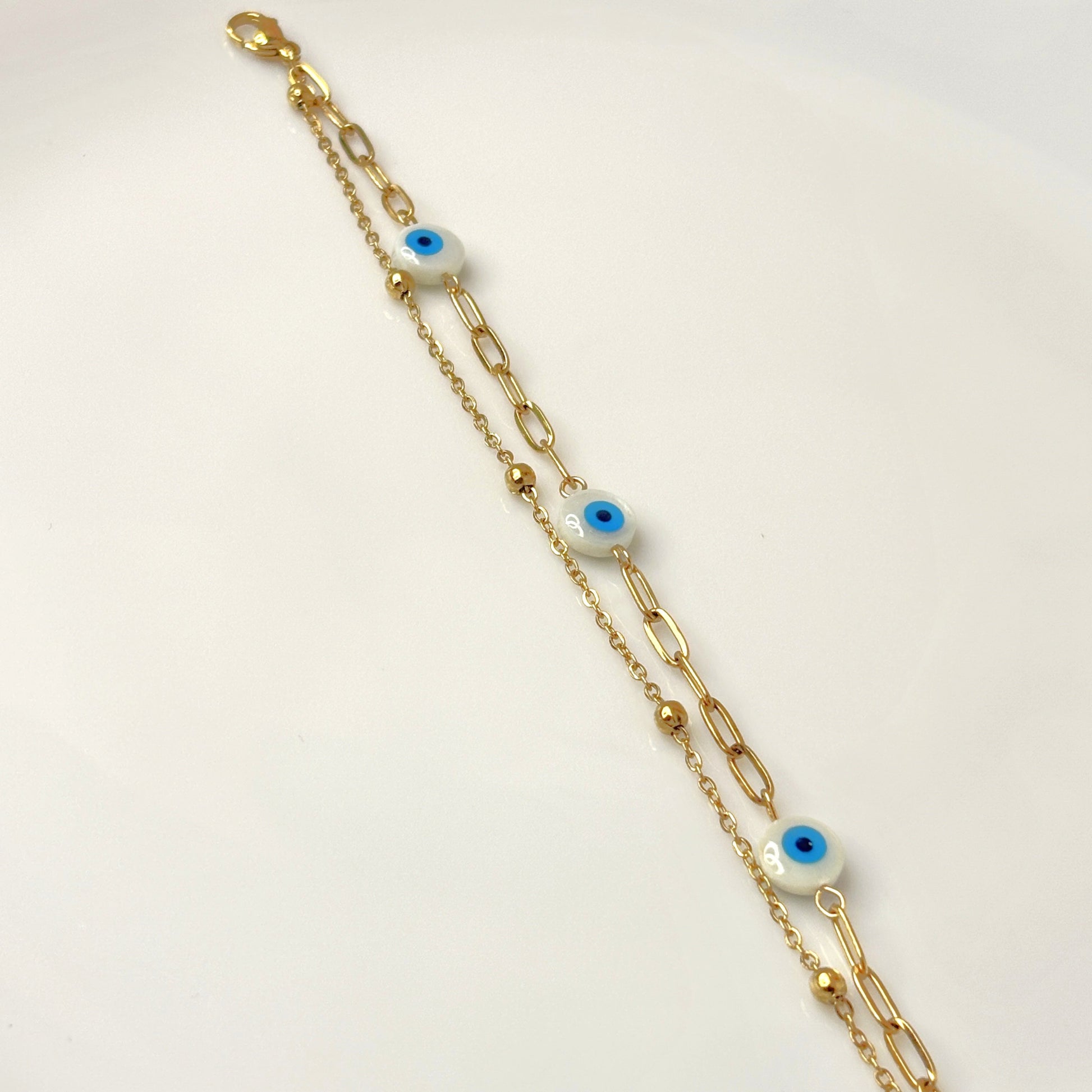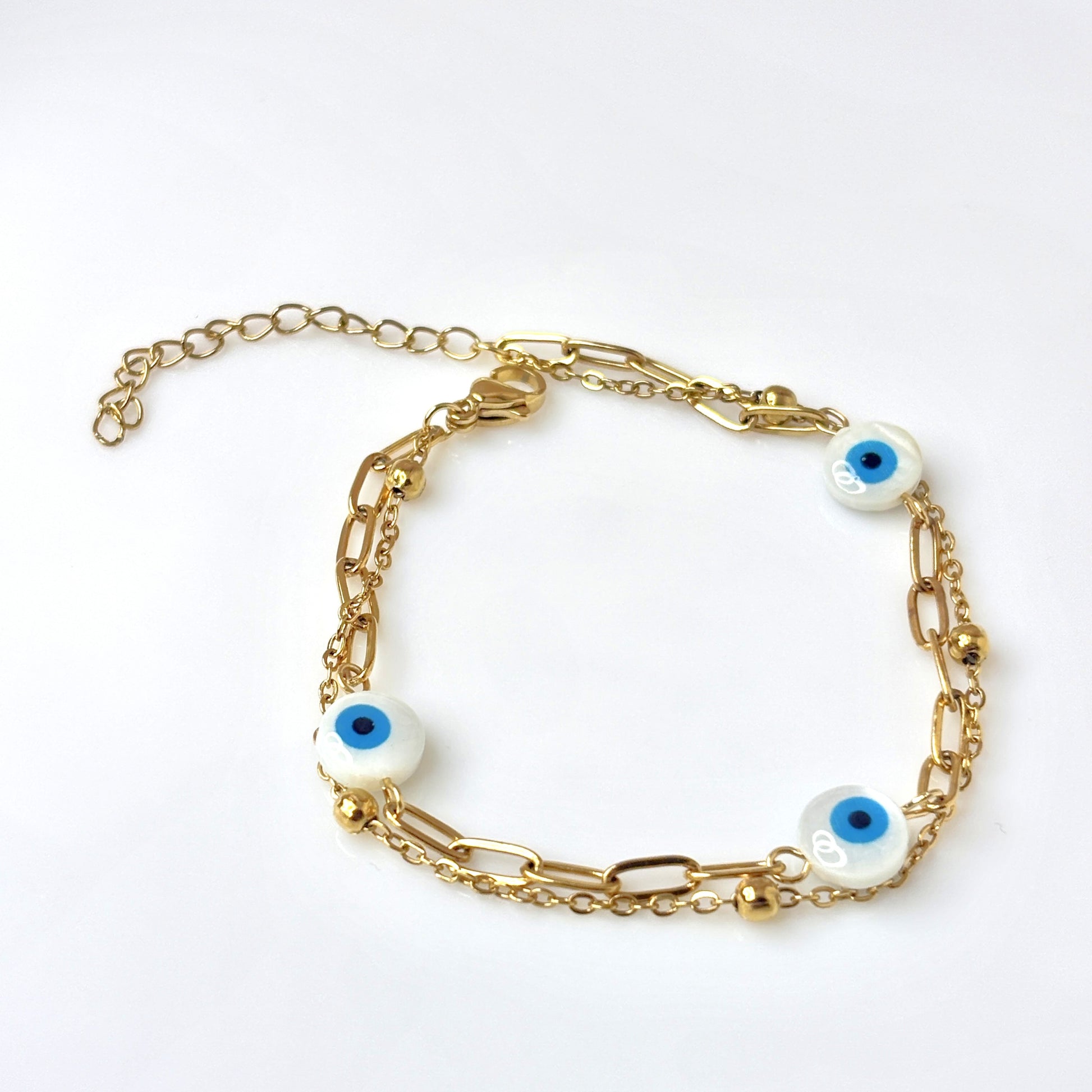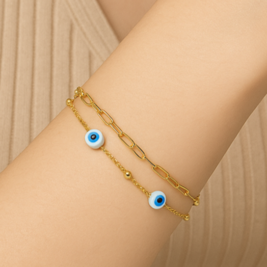 A graceful bracelet with symbolic eye charms and fine chain details. Crafted to blend elegance with a touch of mystic protection for your everyday style.