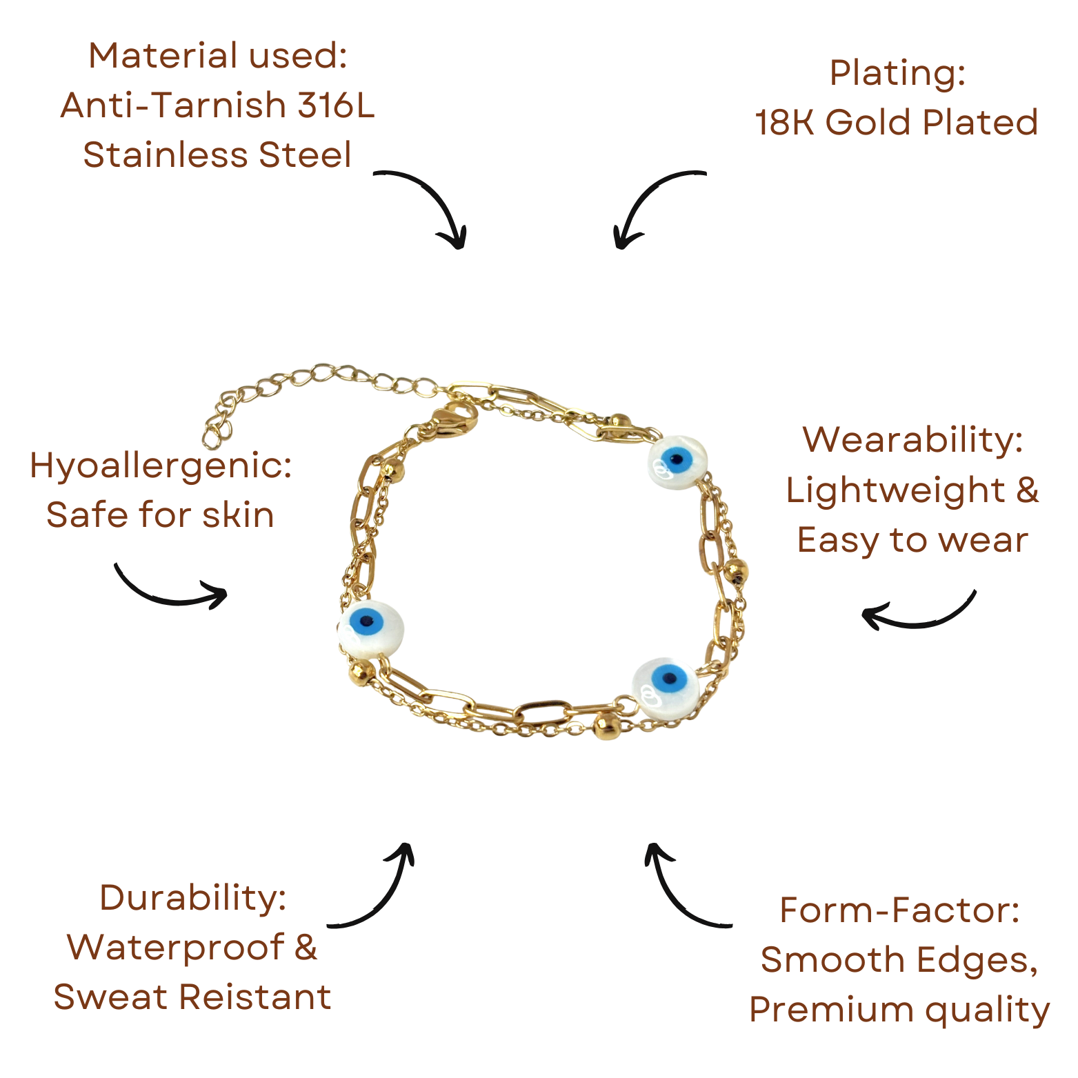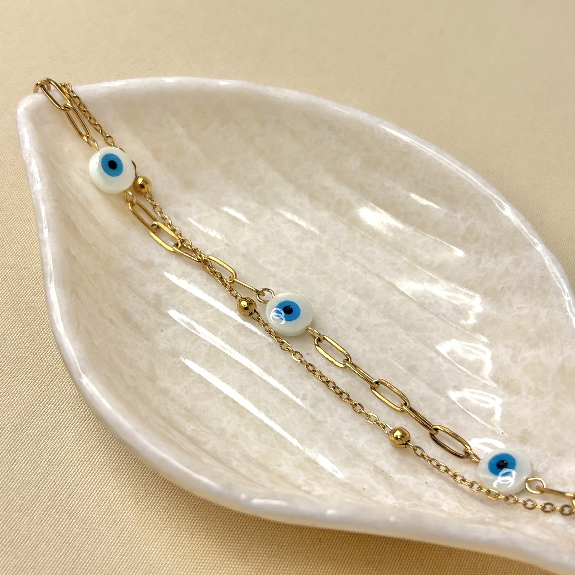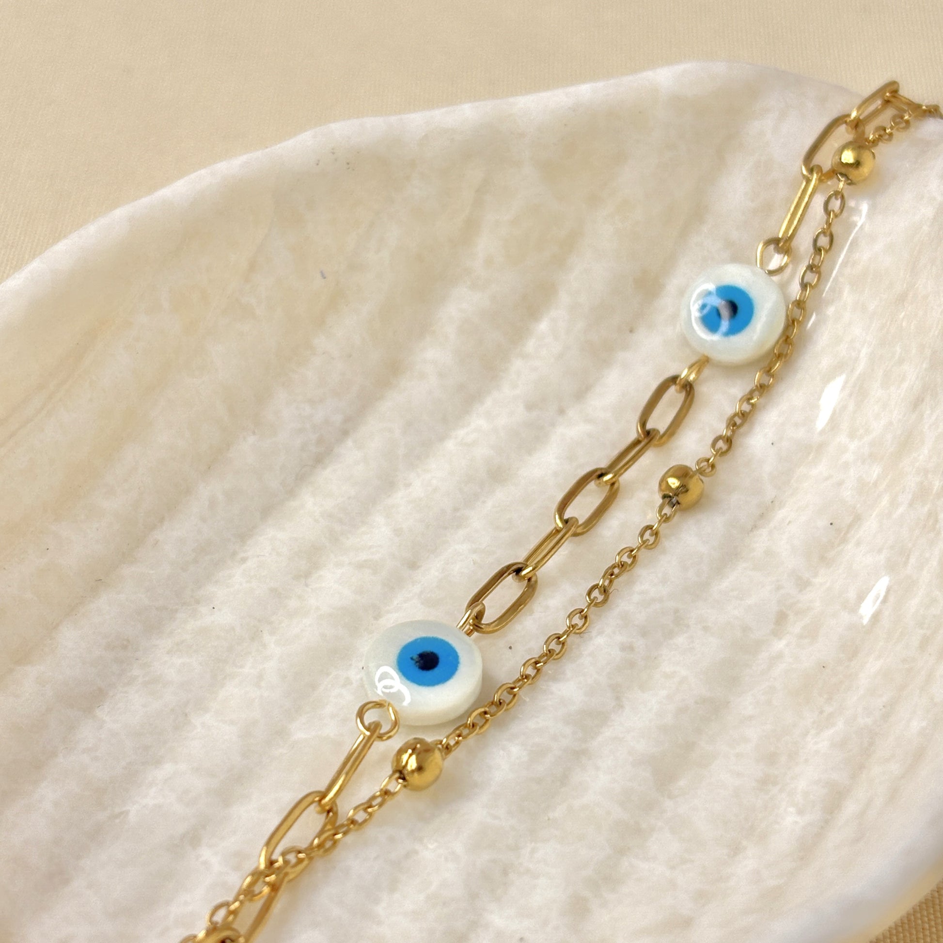 A graceful bracelet with symbolic eye charms and fine chain details. Crafted to blend elegance with a touch of mystic protection for your everyday style.