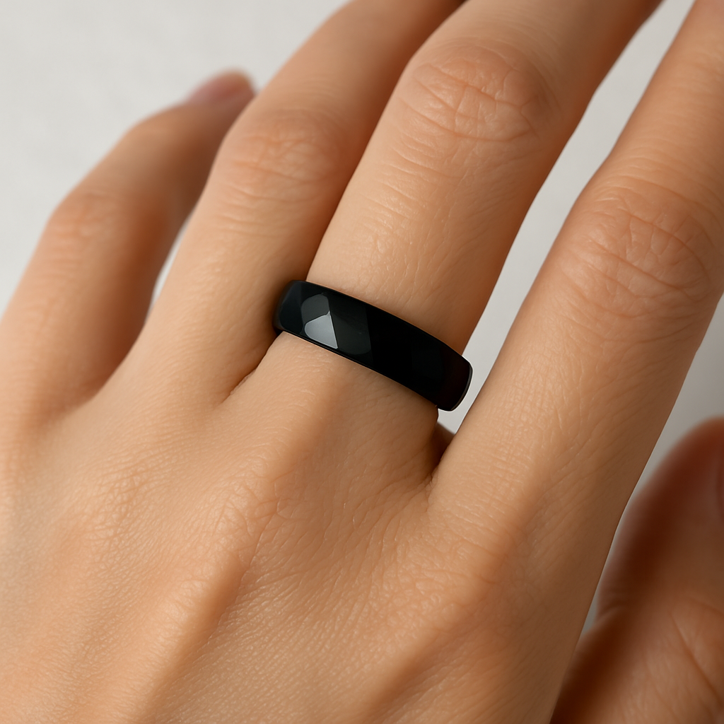 A striking black faceted band that blends minimalism with bold energy. Sleek, powerful, and versatile—it’s the perfect statement for those who prefer their style dark and refined.