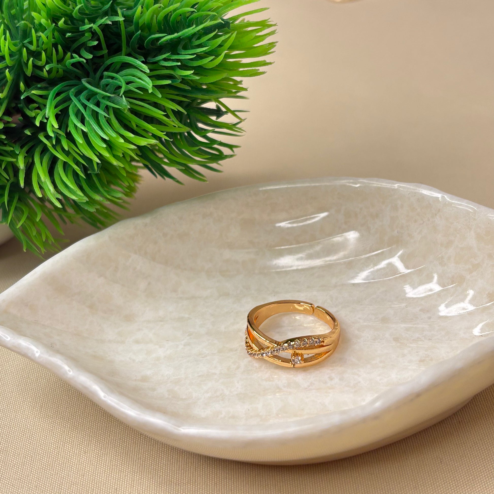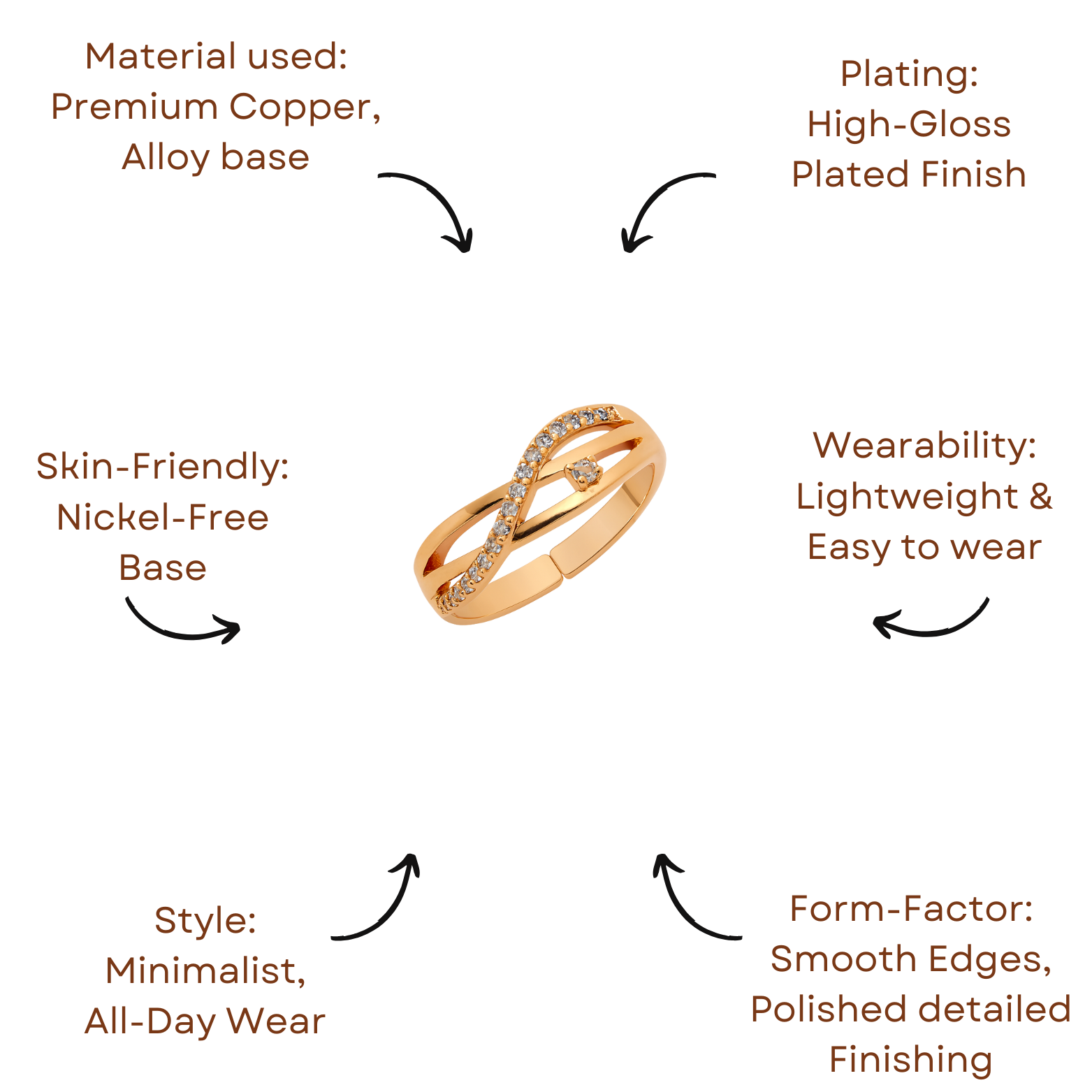 A chic, gold-toned ring with a graceful twist design, lined with shimmering stones for an elegant sparkle. Perfect for adding a touch of sophistication to everyday looks or special occasions.