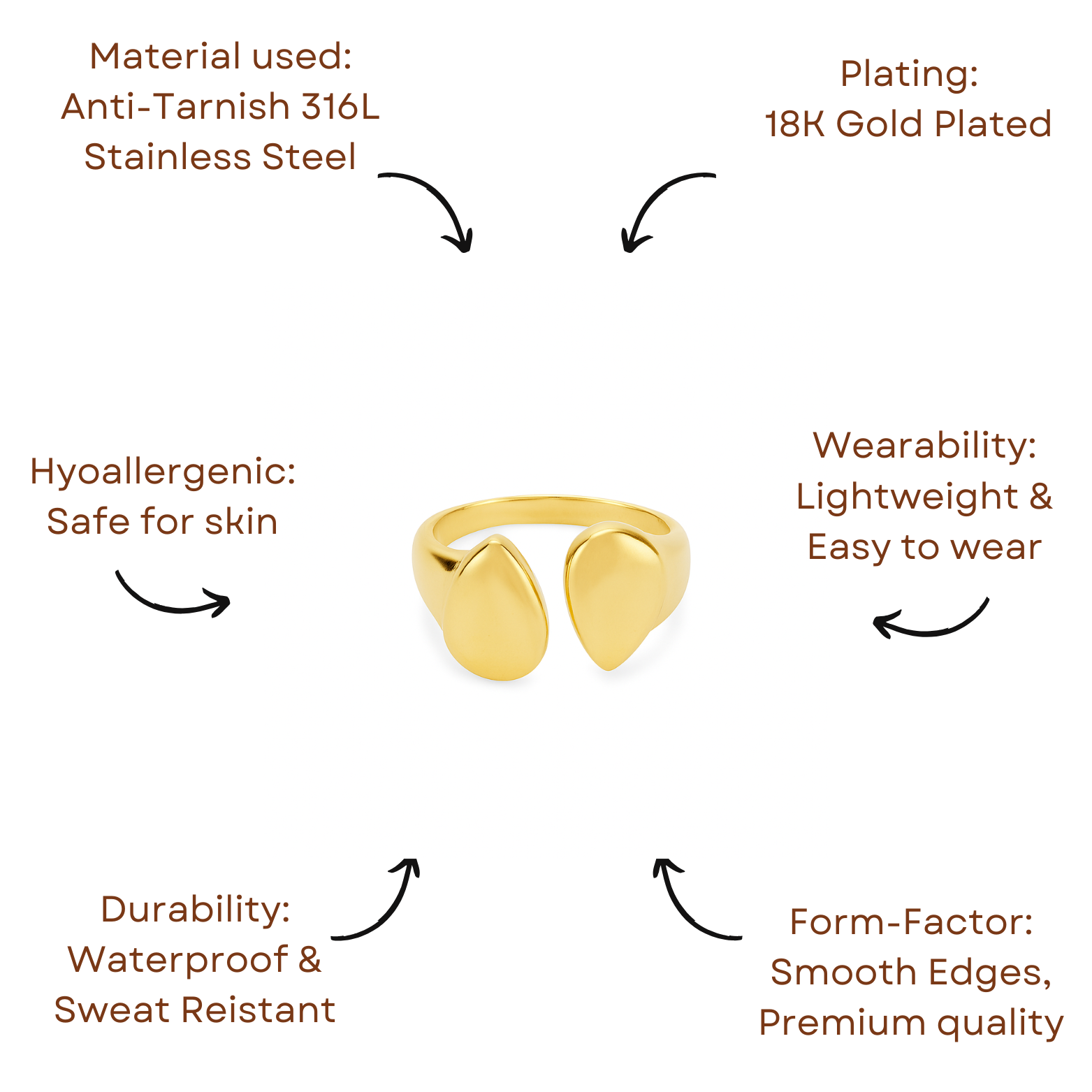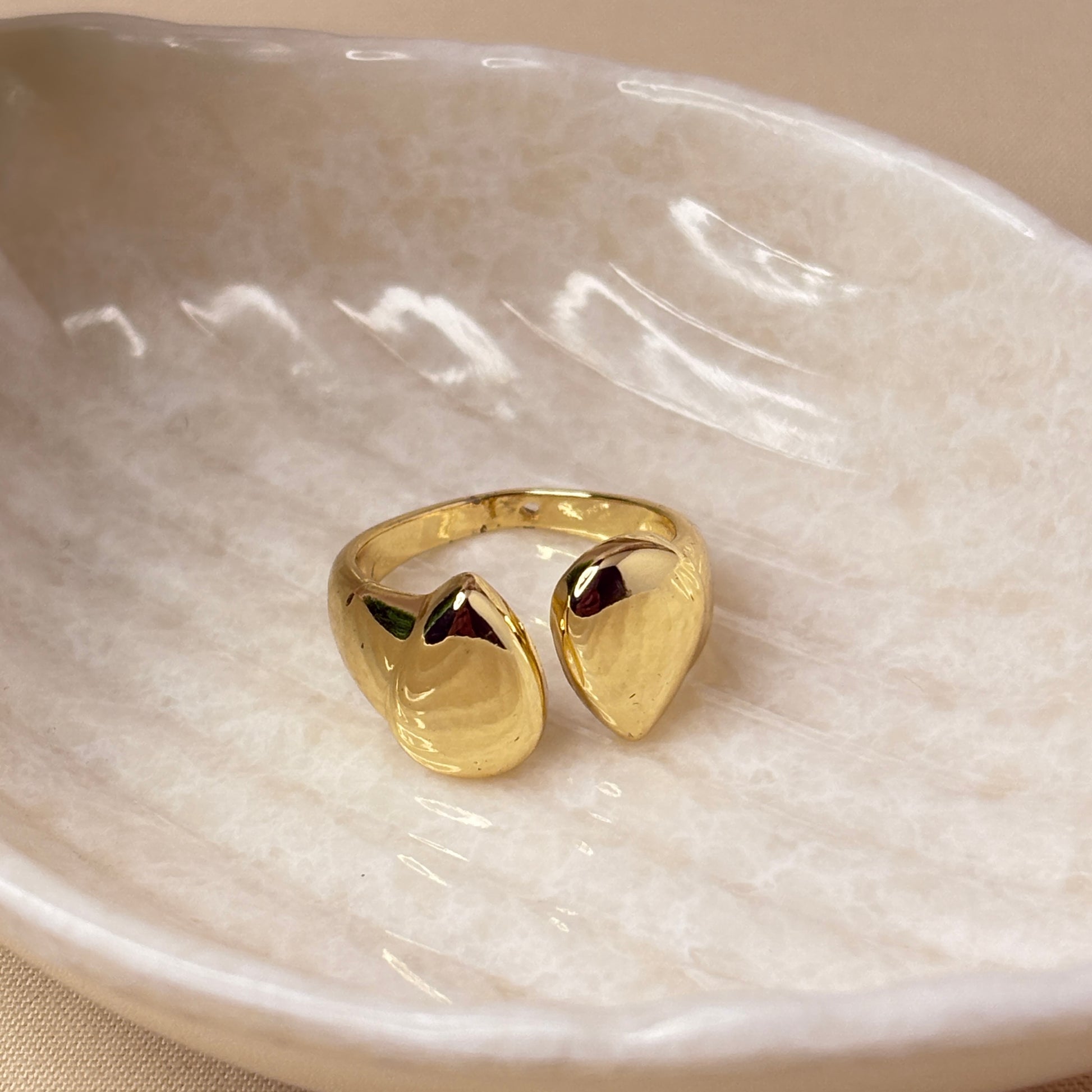 Twin Flame captures the warmth of two souls in perfect symmetry. With its smooth molten gold finish and open-heart design, it’s a symbol of connection, confidence, and timeless charm.