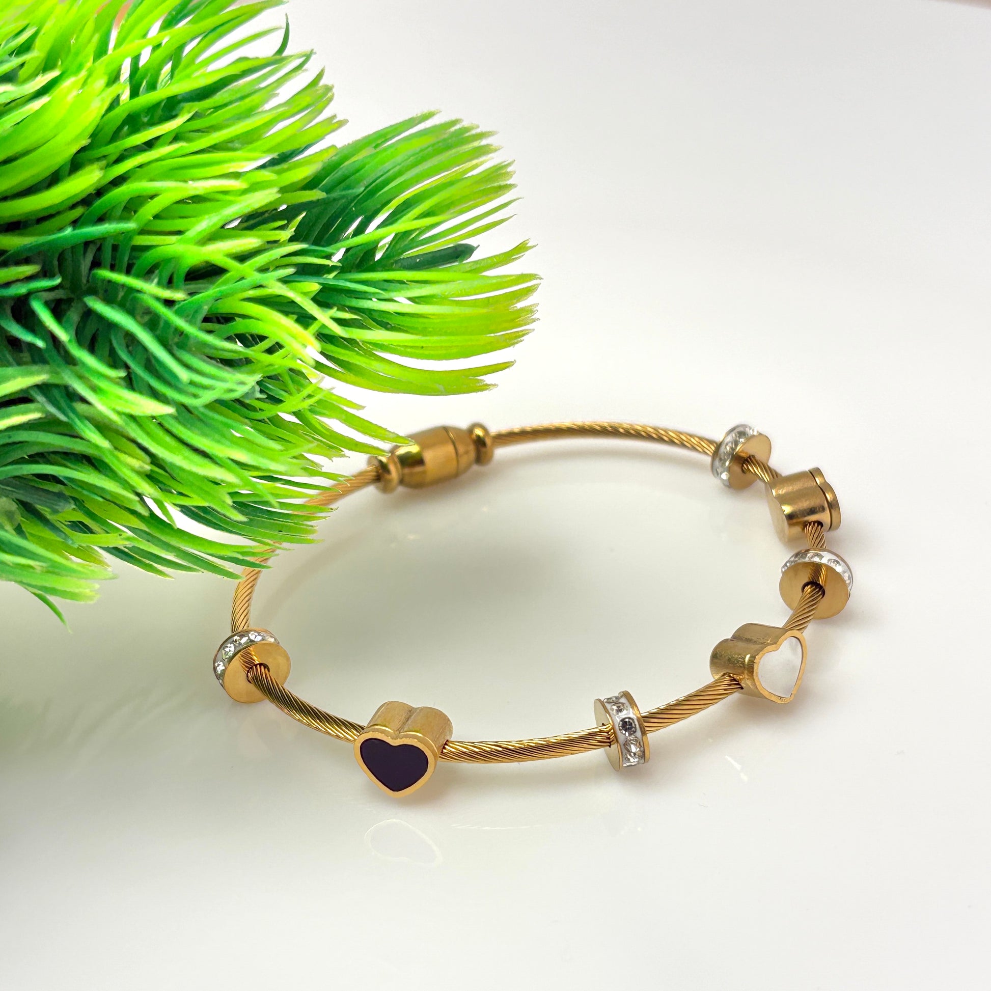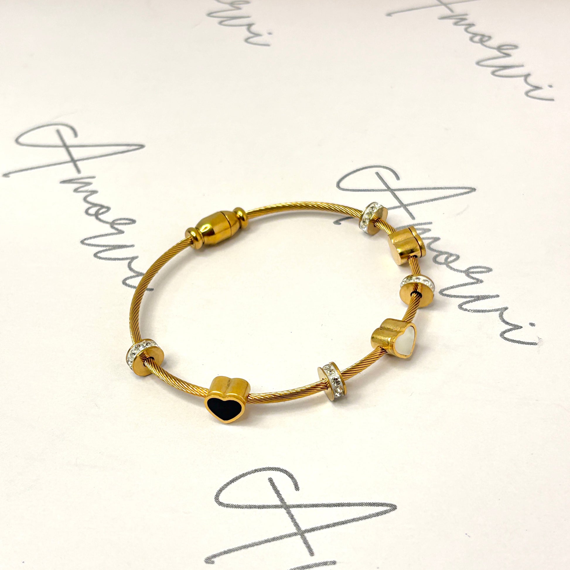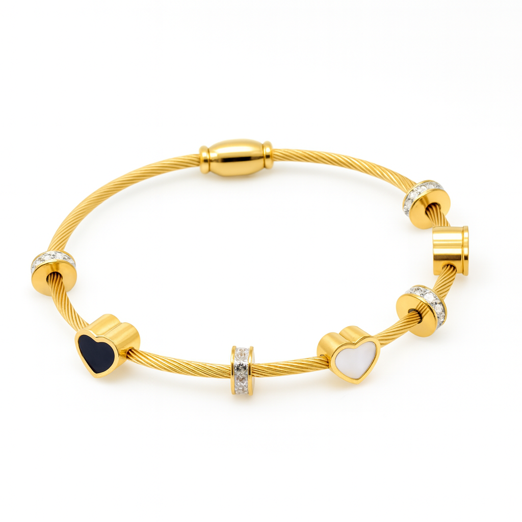 Wrapped in gold tones, this bracelet unites two hearts and sparkling rings. A chic representation of connection and charm for modern styling.