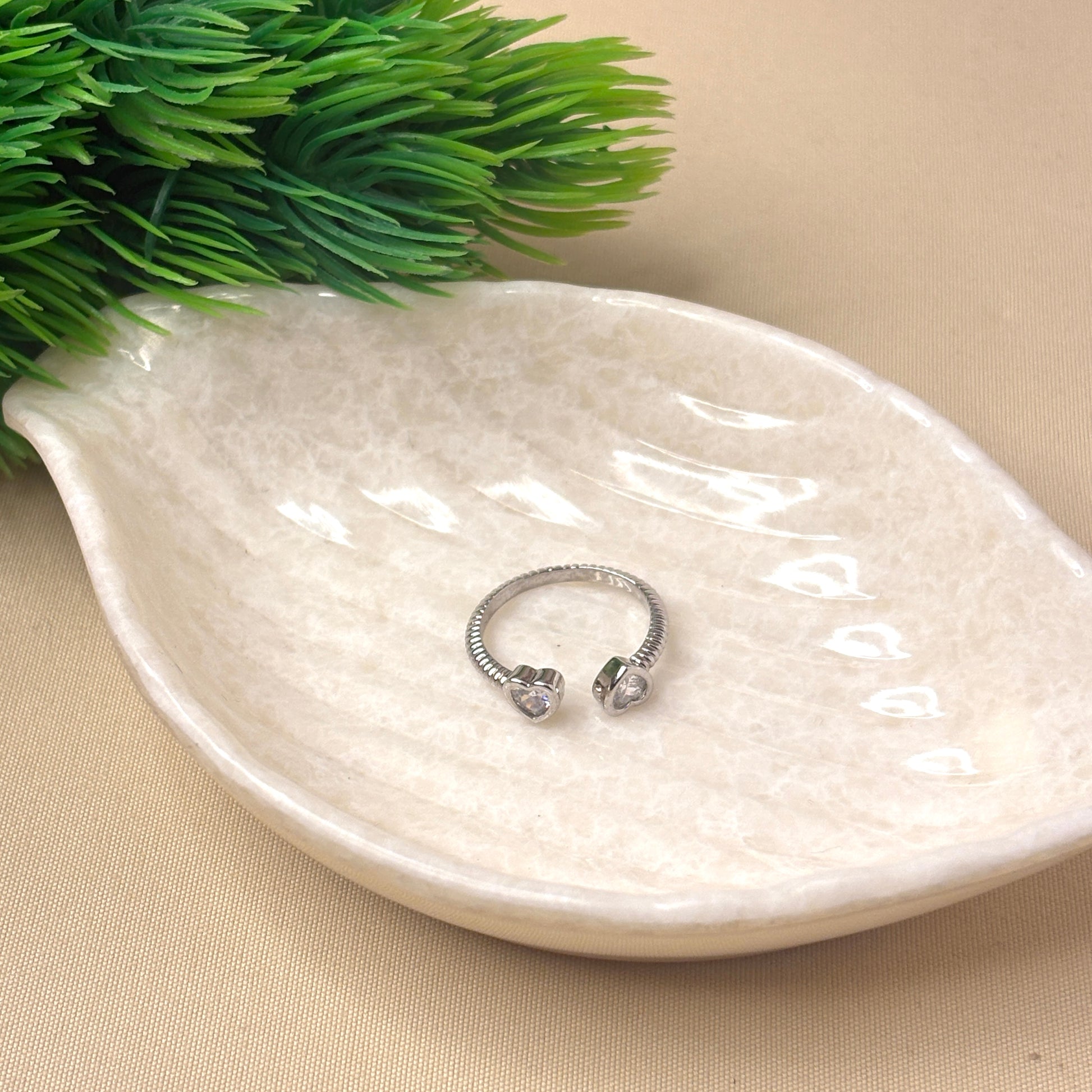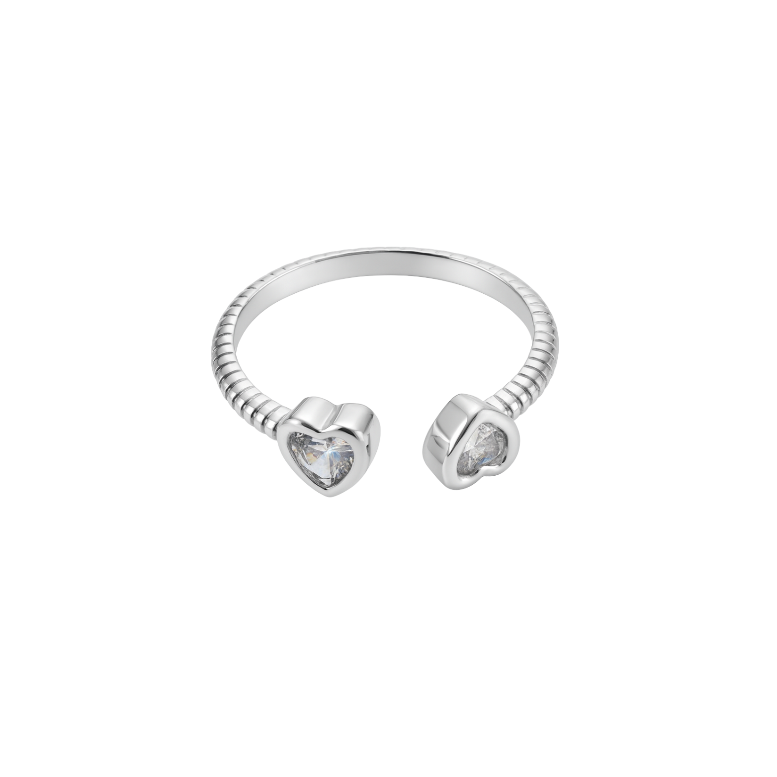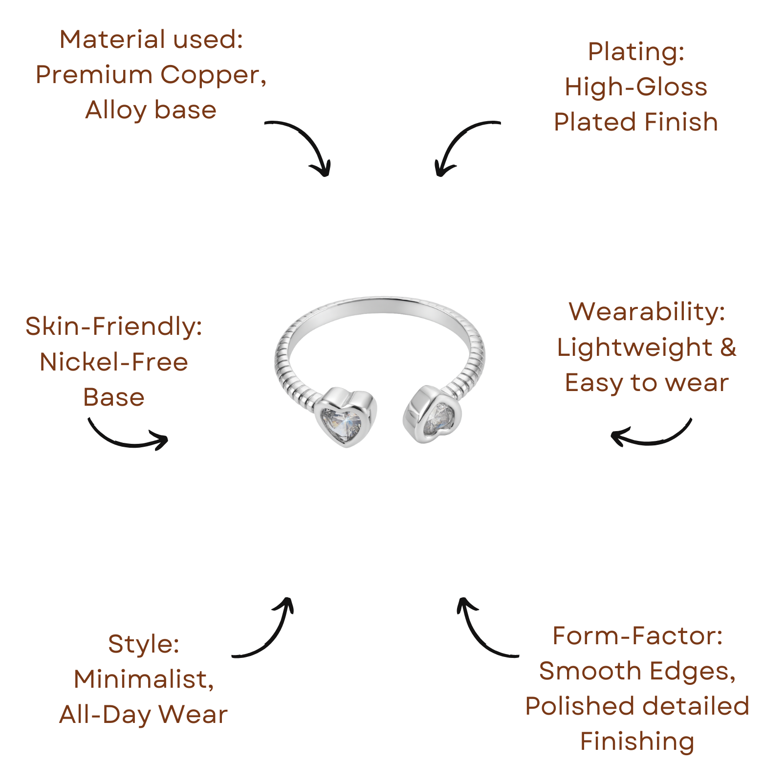 A sleek silver-toned open band ring featuring twin heart-cut crystals at each end, symbolizing balance and connection. Its minimal yet sparkling design makes it a versatile piece for both daily wear and special moments.