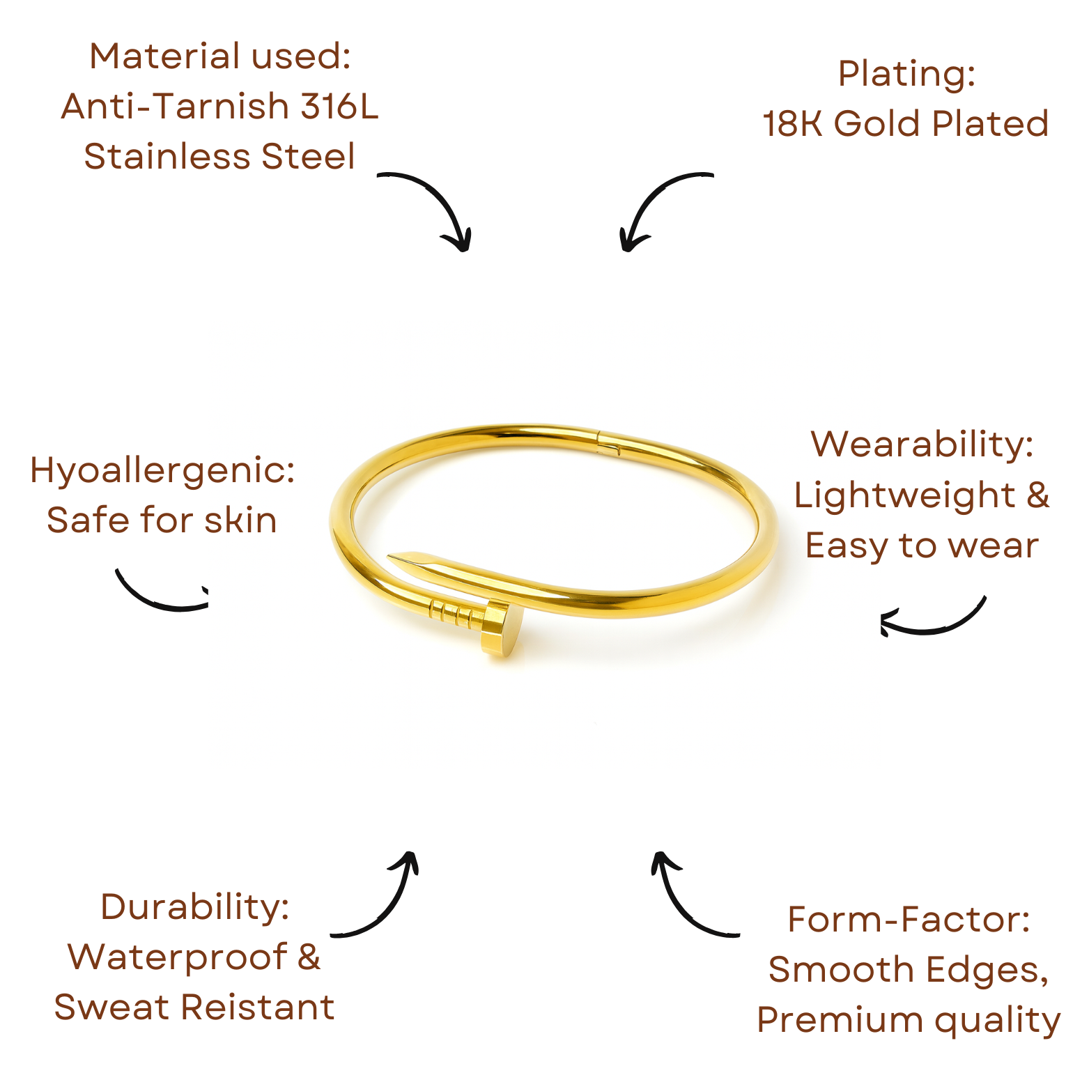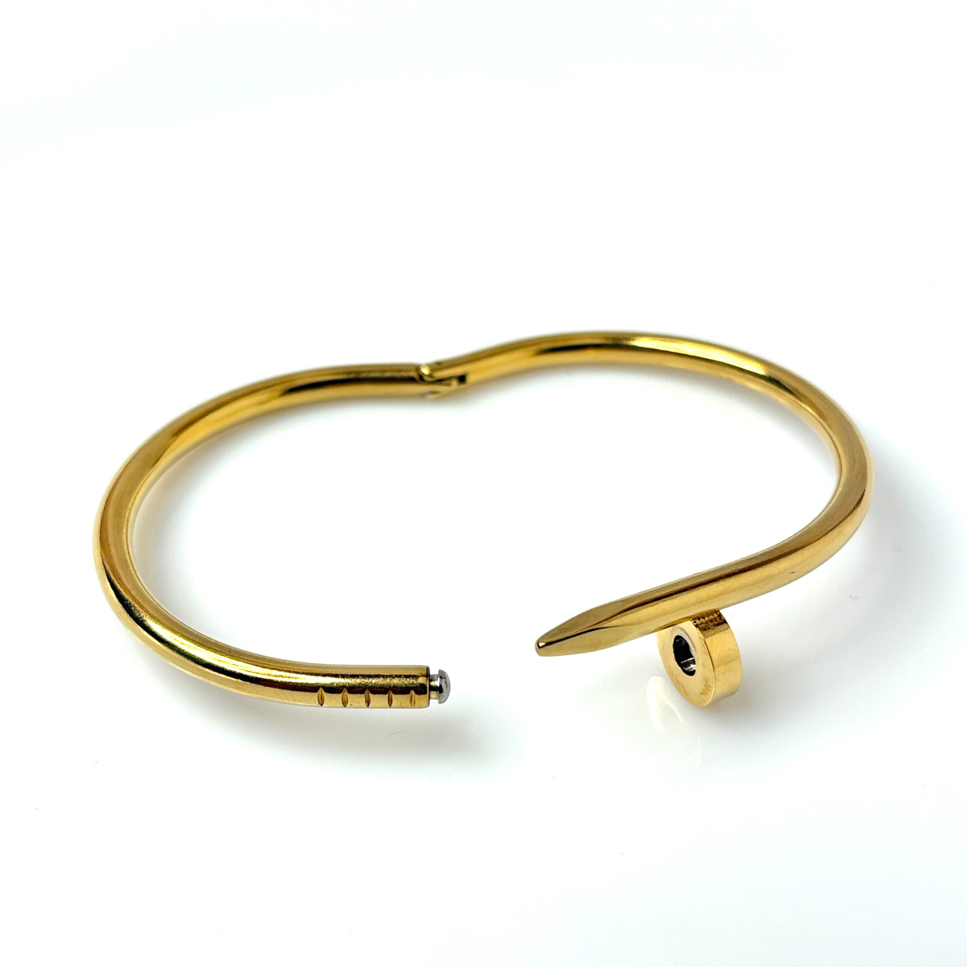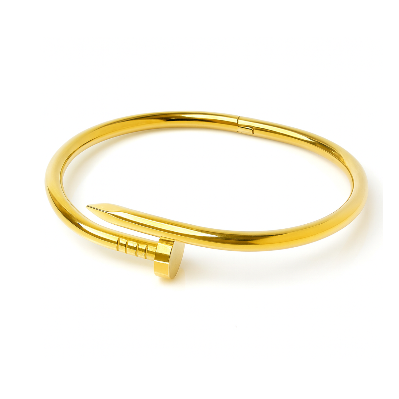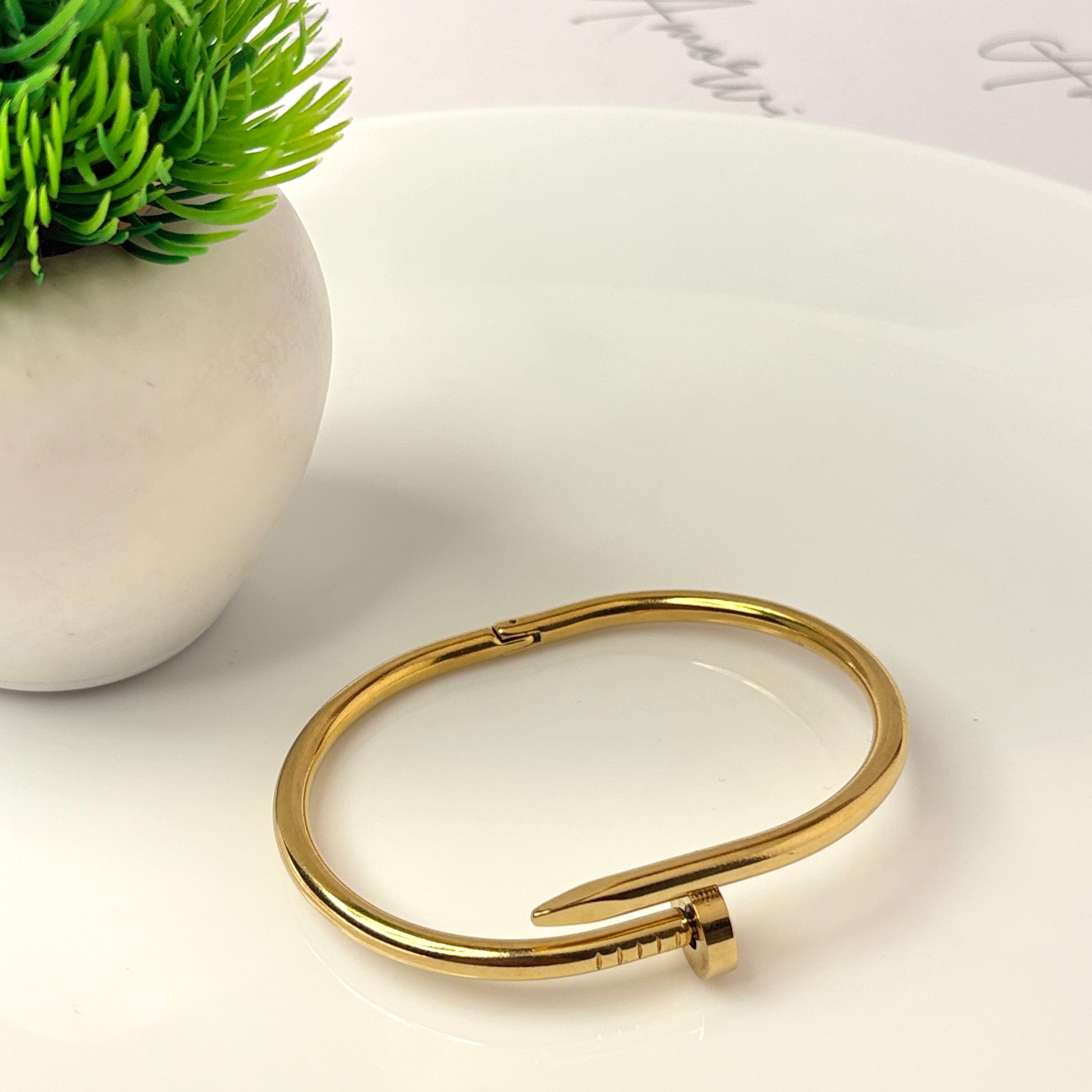 A sleek gold bracelet shaped like a nail for a bold, edgy vibe. Perfect for stacking or wearing solo for a minimalist statement.
