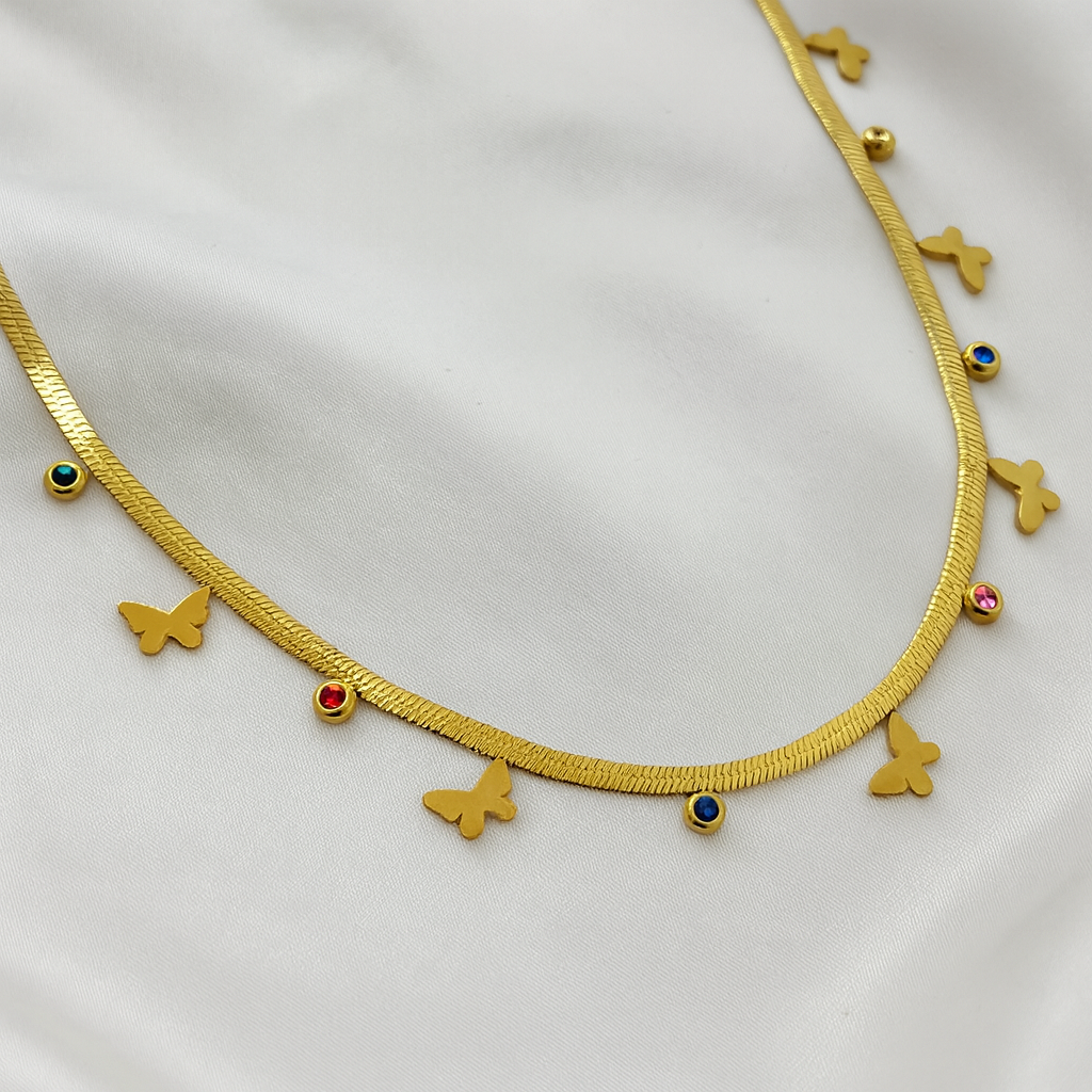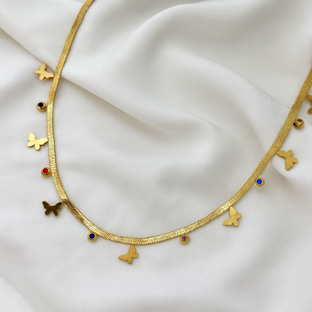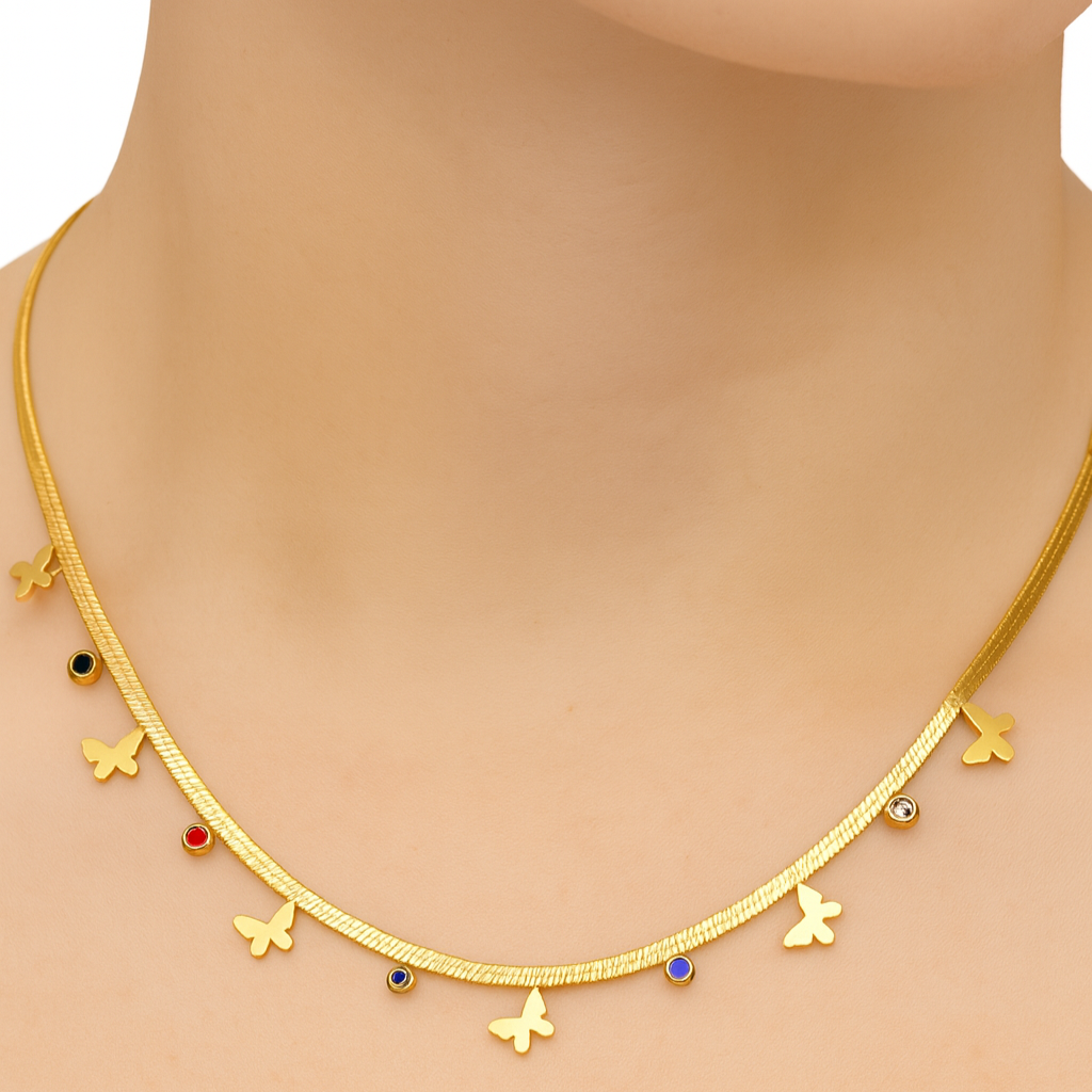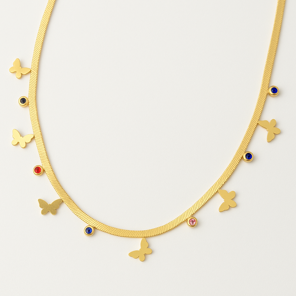 Delicate and playful, this butterfly charm necklace adds a whimsical touch to your jewelry collection. Designed with a sleek golden chain, it features tiny butterflies paired with colorful stone accents for a vibrant yet elegant look. Perfect for everyday wear or as a standout piece for special occasions.